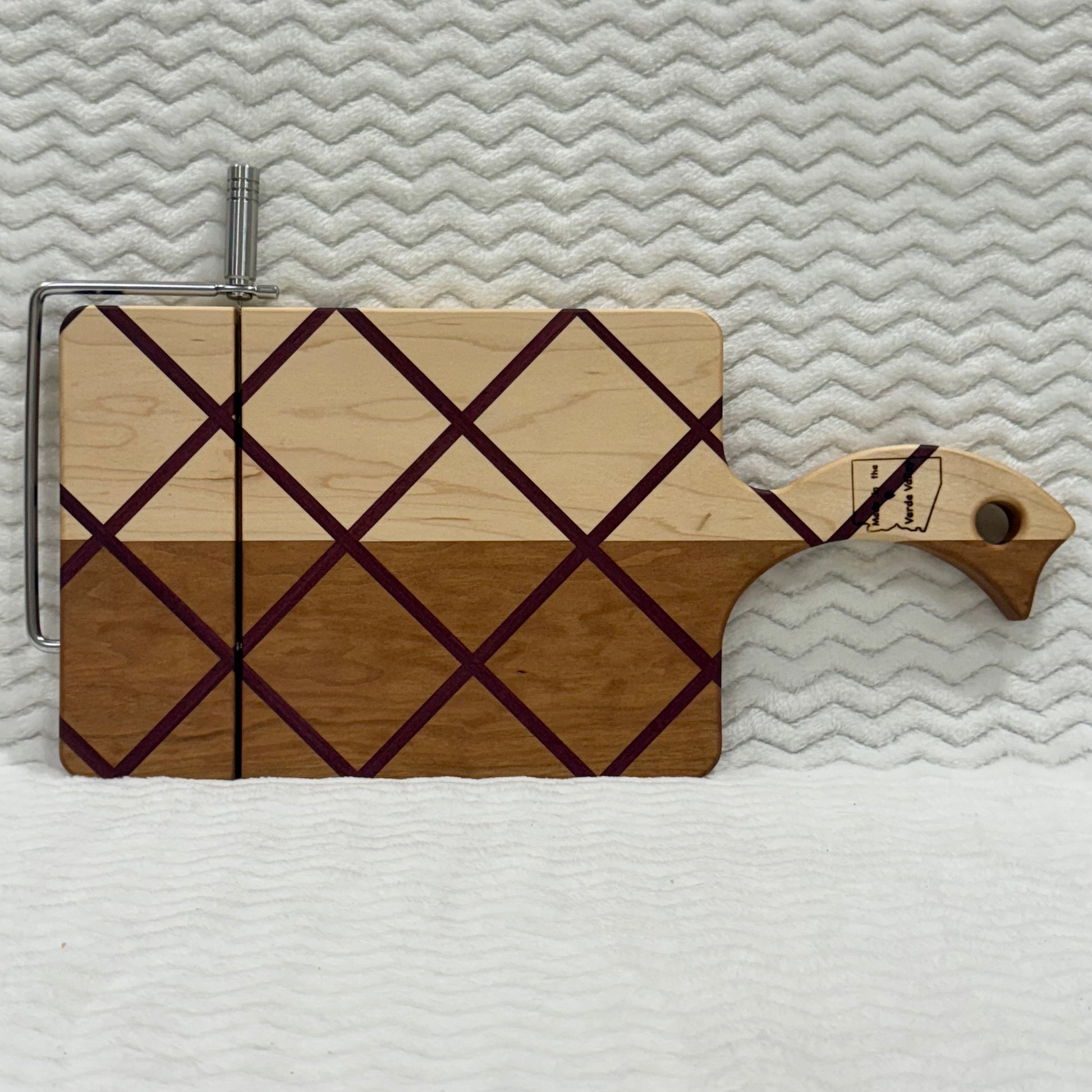 Present your favorite meats and cheeses on this elegant serving board crafted from cherry, hard maple and purple heart woods. It includes a built in stainless steel cheese slicer and comes with two replacement wires with easy-to-follow instructions.