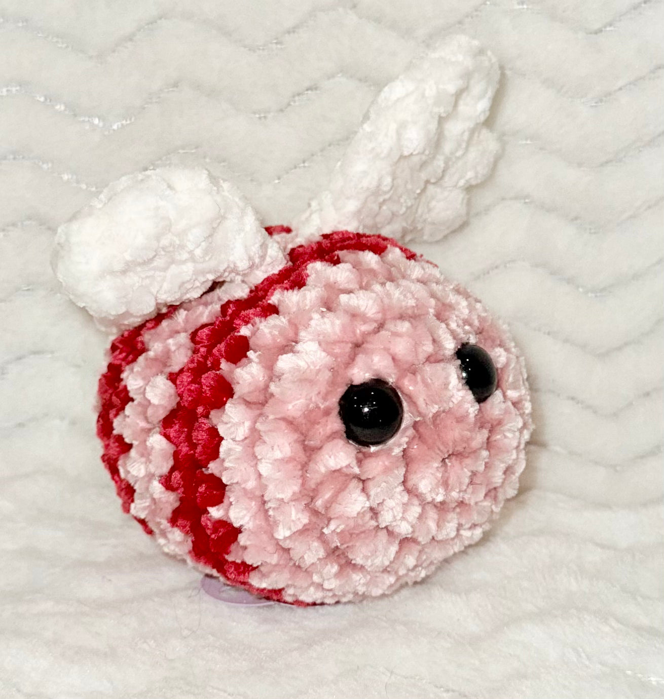 Meet the LoveBug! A tiny bundle of love and cuteness! This 3.5-inch crocheted plush may look like a bee, but it’s all about love with its pink and red stripes and white heart-shaped wings. Handmade with ultra-soft velvet yarn, this little bug is the perfect gift for Valentine's Day, anniversaries, or just to show someone you care.